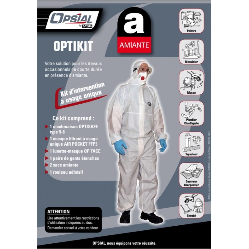 Kit comprenant, une combinaison, un masque, des lunettes, des gants, du ruban adhésif, des surbottes et une poubelle. Ce kit est conçu pour travailler en milieu amianté.